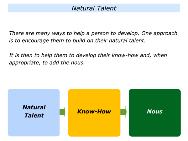 There are many ways to help a person to develop. One approach is to encourage them to have the nerve to build on their natural talent. It is then to help them to develop their know-how and, when appropriate, to add the nous.