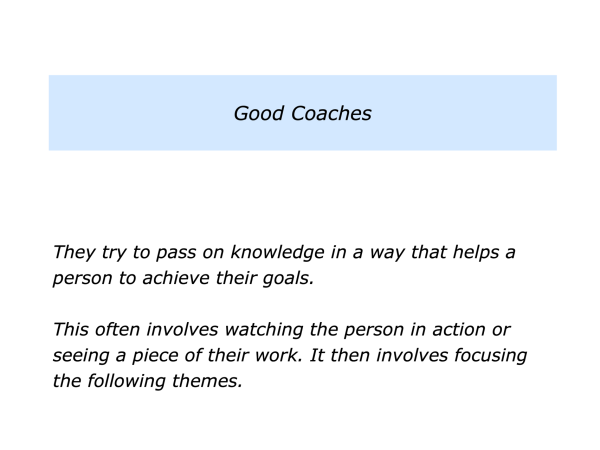 This is an approach taken by many coaches. They watch the person in action or see an example of their work. They may then use the following framework to help a person to improve.
