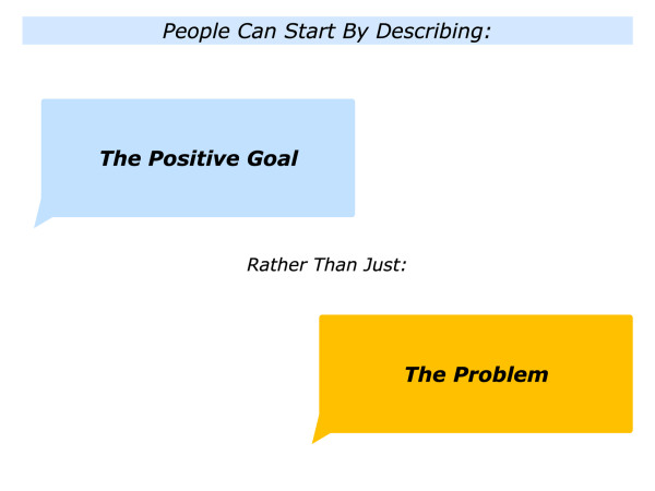 Such an approach does not necessarily inspire people or fire their imagination to solve the problem. Starting by highlighting the problem can create a feeling of blame, negativity or hopelessness.