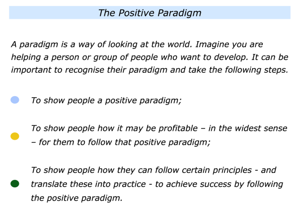 Imagine that you are working with a person, team or organisation that wants to develop. It can be important to recognise their present paradigm and then to take the following steps.
