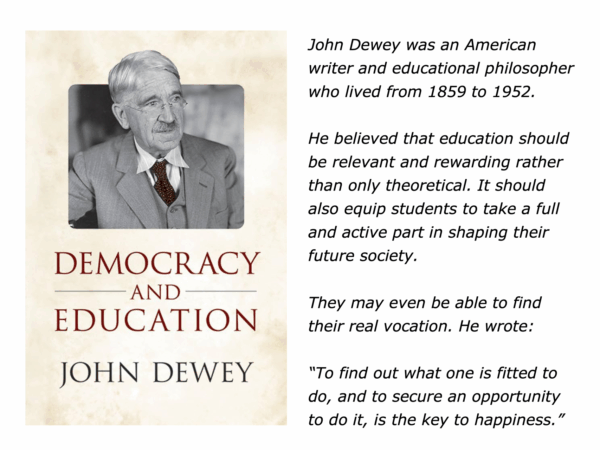 John believed education must be linked to the child’s experience. Students were more likely to embrace mathematics, for example, if they could see how it applied to their daily lives. He wrote in My Pedagogic Creed.