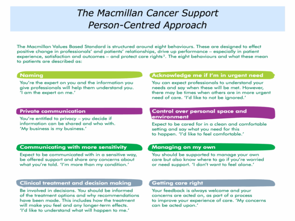 Some organisations aim to follow the person-centred approach. The medical profession, for example, now often aims to put the patient at the centre. The Macmillan Cancer Support organisation describes this in the following way.