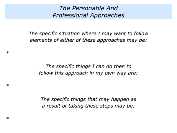 Let’s return to your own life and work. Looking ahead, can you think of a situation where you may want to follow elements of the personable or professional approach?