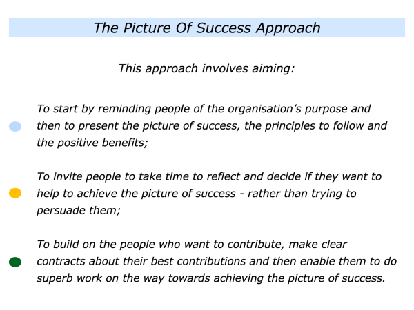 To invite people to take time to reflect and decide if they want to help to achieve the picture of success – rather than trying to persuade them;