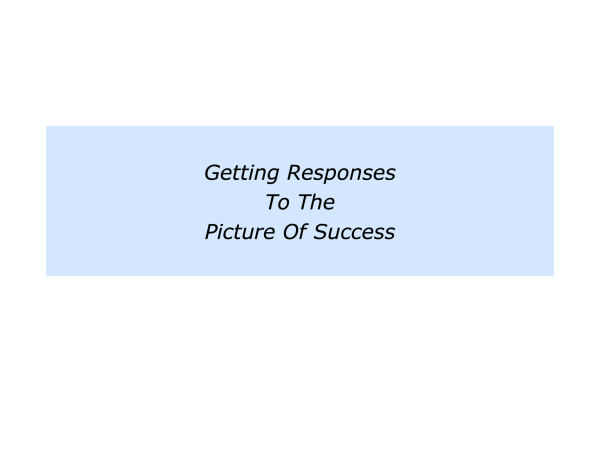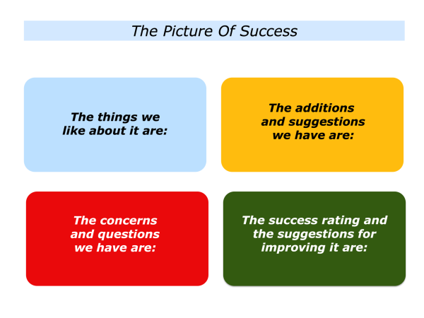 Some leaders may add another stage. They give people the opportunity to go into groups and do several exercises. They invite people to focus on the picture of success and consider the following themes.