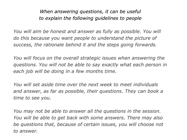 Imagine that a leader has either given people the opportunity to ask questions for information or to do the exercises described above. Such a leader may then say something like the following lines.