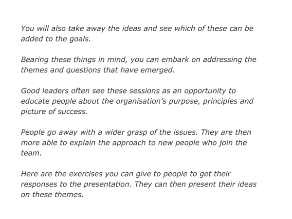 Such leaders then invite people to present back their ideas. Some of these may then be incorporated into the action plan for achieving the picture of success.