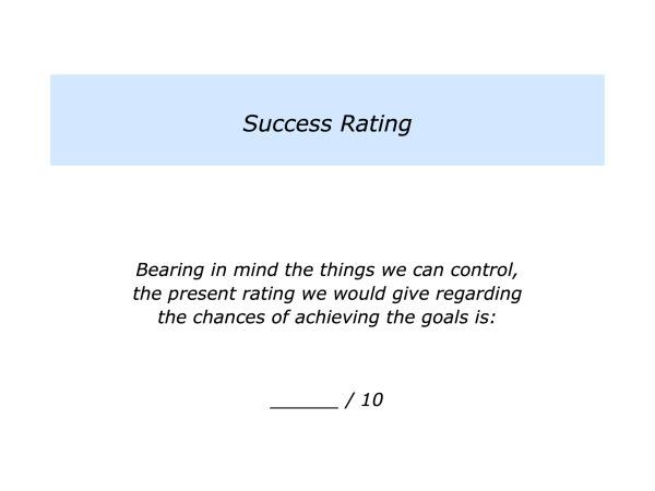 Success Rating – The present rating they would give regarding the chances of achieving the goals. This to be done on a scale 0 – 10.