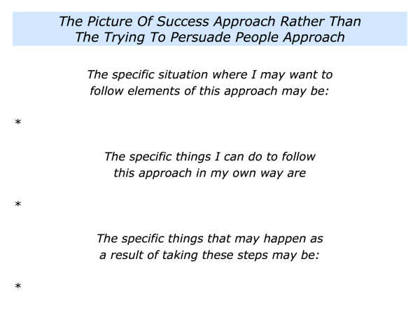 Different leaders follow the picture of success approach – rather than the trying to persuade people approach – in different situations. When doing so, they may follow the steps described at the beginning of this piece.