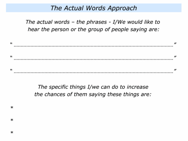 The next step is to describe the specific things they can do to increase the likelihood of the stakeholders saying these things and then translate these ideas into action plans. They then do their best to ensure people are saying these things.