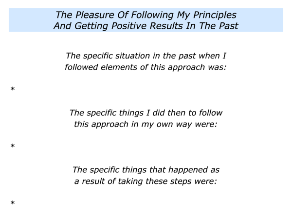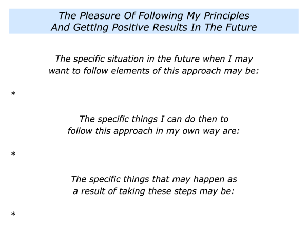 Let’s return to your own life. Can you think of a situation where you may want to follow elements of this approach? It may be one where you will get pleasure from following your principles and also get positive results.