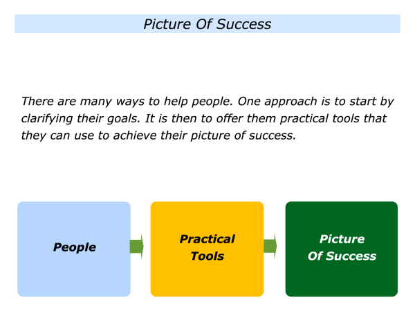 There are many ways to help people. One approach is to start by clarifying their goals. It is then to offer them practical tools that they can use to achieve their picture of success.