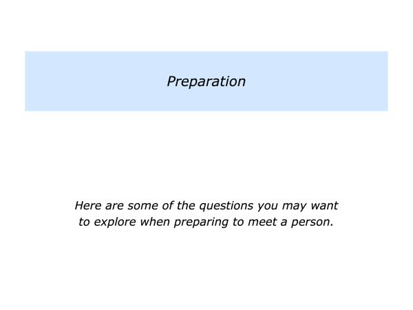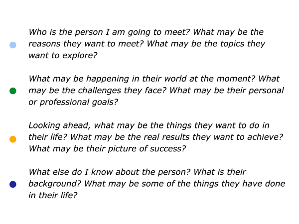 Who is the person I am going to meet? What do I know about the person? What may be the reason they want to meet? What may be the topics they want to explore?