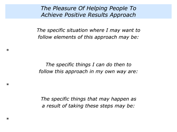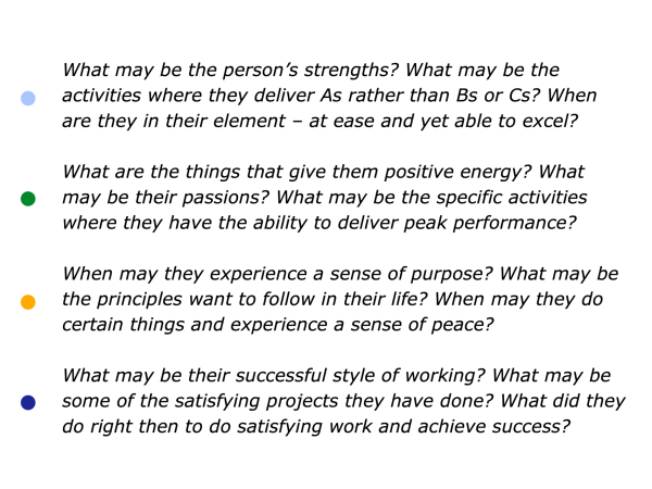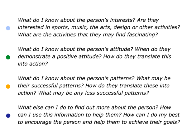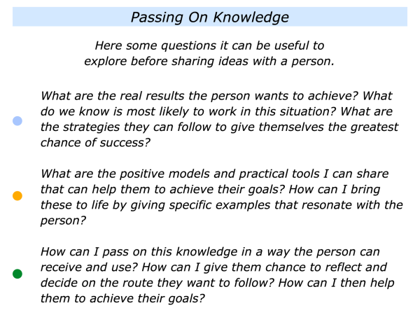 How to clarify the strategies that seem to work in this kind of situation … How to clarify the knowledge – the positive models and practical tools -that you can share to help them to achieve their goals.