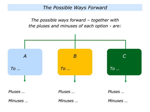 Bearing these in mind, you may then want to help the person to explore the possible ways forwards. It can also be useful to look at the pluses and minuses of each option.