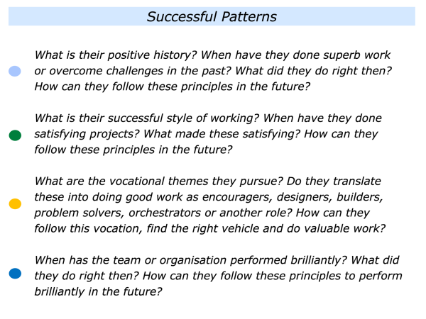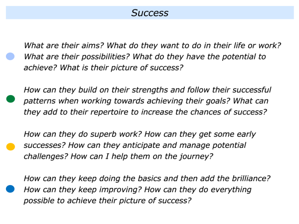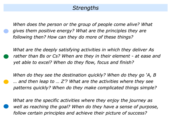 It involves helping people to build on their strengths and follow their successful patterns. Sometimes it involves helping them to find solutions to challenges and achieve their picture of success.