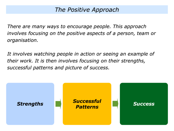 There are many ways to encourage people. One approach is to watch people in action or see an example of their work. It is to focus on their strengths, successful patterns and, if appropriate. help them to achieve their picture of success.