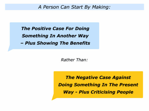 Starting by making the negative case against the present way of doing something can generate negative energy. It can also come across as critical and lead to people closing down.