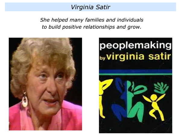 Best known for her remarkable work in therapy sessions, aspects of her work were also passed on her books. Virginia expressed some of her ideas in the following ways.