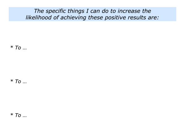 Imagine that you have clarified the specific things you can do to increase the chances of achieving the desired results. If appropriate, you can then mentally rehearse following these strategies. This then leads to the next step.