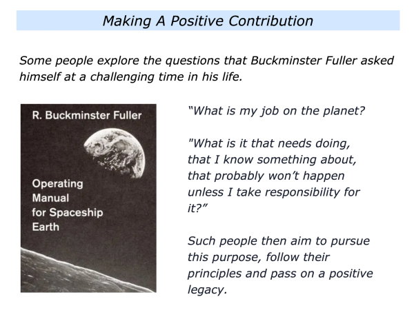 Different people choose different ways to clarify the contribution they want to make during their lives. Some people explore questions similar to those asked by Buckminster Fuller at a challenging time in his life.