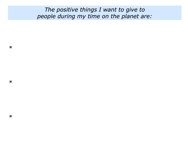 If you wish, you may want to consider what you want to give to other people during your time on the planet. What could be the benefits of giving these to people?