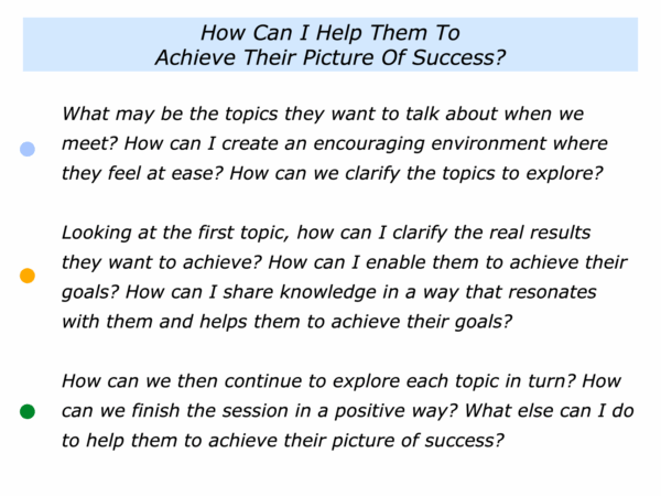 They aim to empower people. Some do this by helping people to build on their strengths and follow successful strategies. They then help the people to work towards achieving their picture of success.