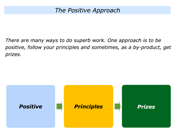 There are many ways to do superb work. One approach is to be positive, follow your principles and sometimes, as a by-product, get prizes. One person made an addition to this approach. They said: