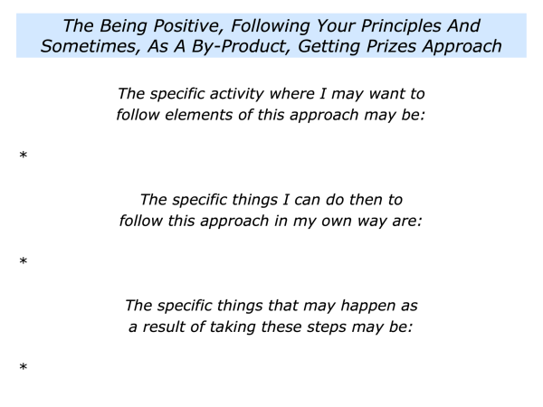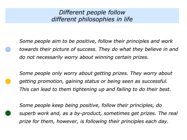 Let’s return to your own life and work. Can you think of a specific situation where you may aim to be positive, follow your principles and sometimes, as a by-product, get prizes?