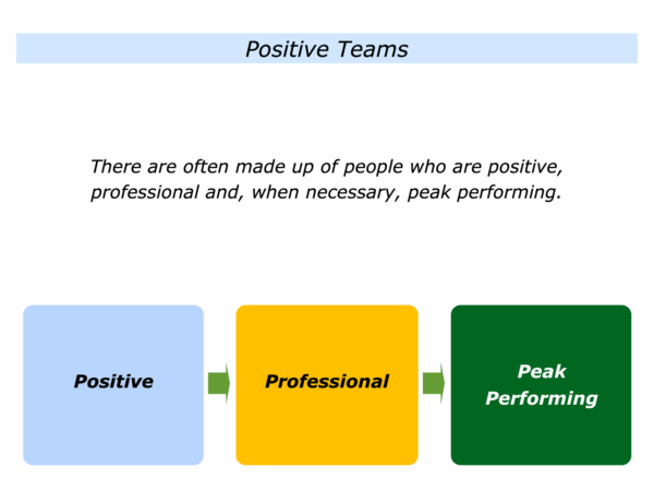 Imagine that you lead your present team. What are the qualities you want your people to demonstrate? One approach is to employ people who aim to be positive, professional and, when necessary, peak performing.