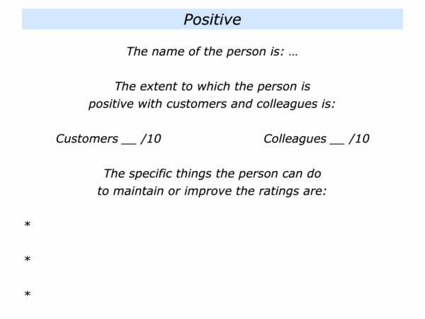 On a scale 0 – 10, to what extent would I rate the person as being positive: a) towards customers; b) towards colleagues?