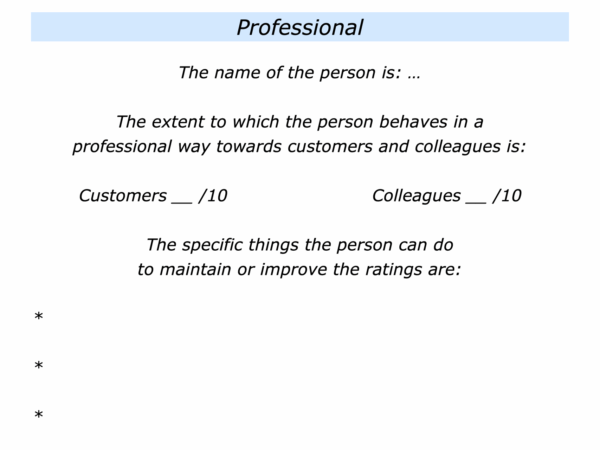 On a scale 0 – 10, to what extent would I rate the person as being professional: a) towards customers: b) towards colleagues?