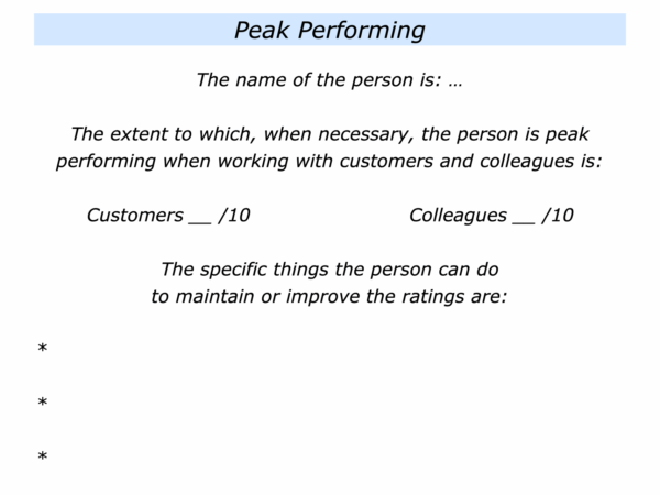 On a scale 0 – 10, to what extent do I rate the person regarding them to, when appropriate, being peak performing: a) when working with customers: b) when working with colleagues?