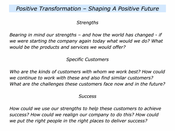 They then explored how to transform parts of the business to shape a positive future. The leader gathered key people in the company and encouraged them to work through the following themes.