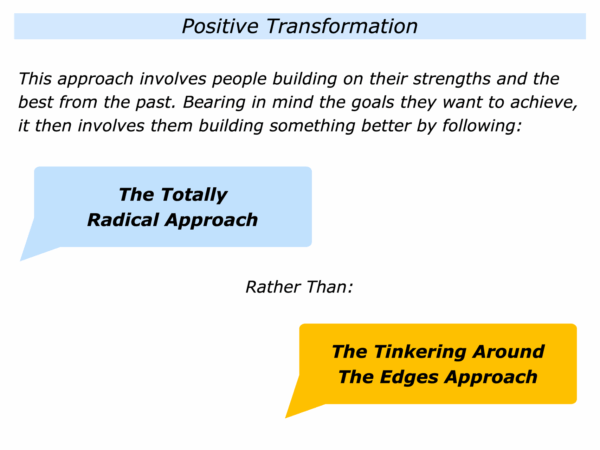 The positive transformational approach calls for people building on their strengths rather than doing some completely alien. The art lies in helping a person, organisation or society to find these strengths.
