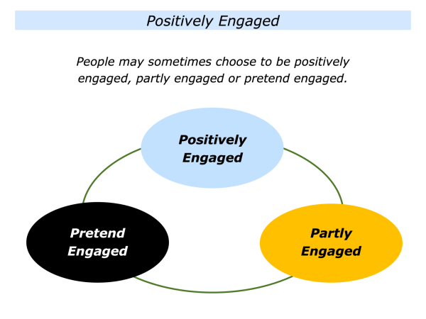 People often do their best work when they are positively engaged rather than partly engaged or pretend engaged. This sounds obvious but it can be important to recognise your different levels of engagement. Let’s explore these themes.