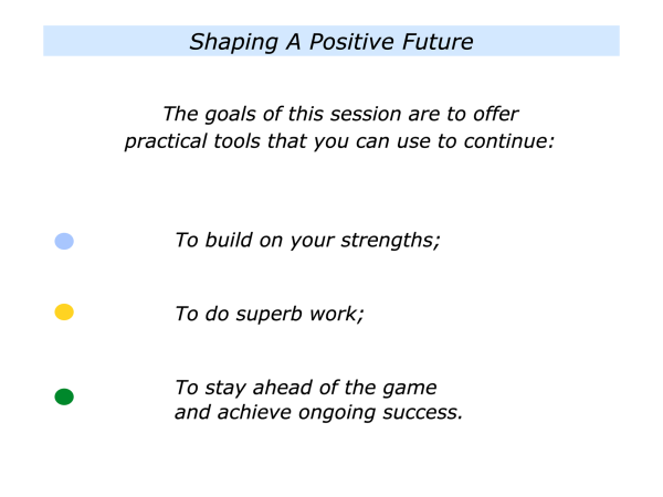 Here is the first slide I used, for example, to introduce the aims for a session I did with one organisation. The aims were to provide people with practical tools that would help them to shape a positive future.
