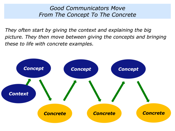Good communicators keep moving from the concepts to the concrete and give examples that resonate with people. Some do this by taking the following approach.