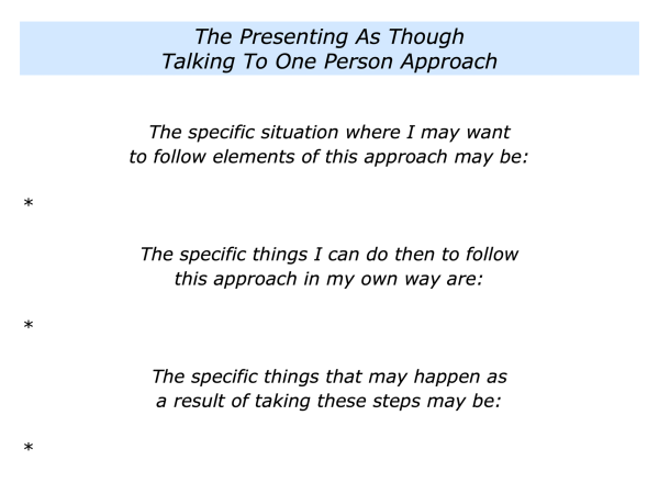 The following piece explores another approach. This involves presenting as though talking to one person. It is also important to make the session compelling, however, and cover themes that resonate with many people in the group.