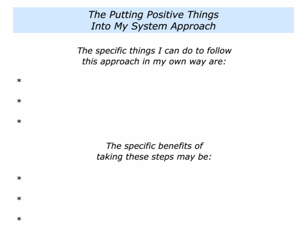 This approach follows the principle that: What we focus on we become. If we focus on positive things, we may become more positive. If we focus on negative things, we may become more negative.