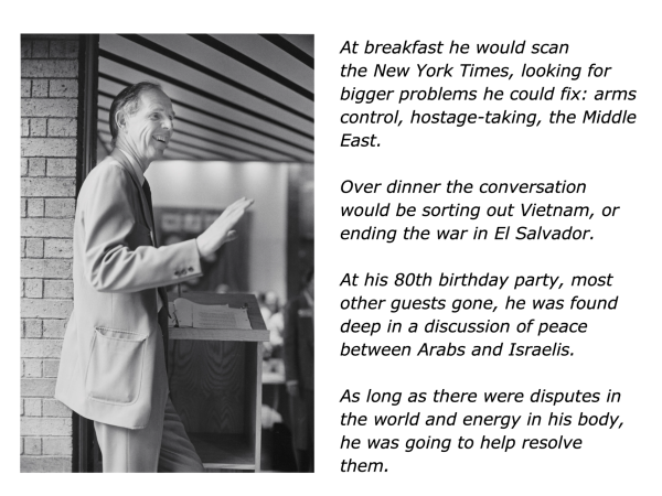 Later he contributed to seeking peace in the Middle East. This involved working on President Sadat’s trip to Jerusalem and the subsequent summit at Camp David.