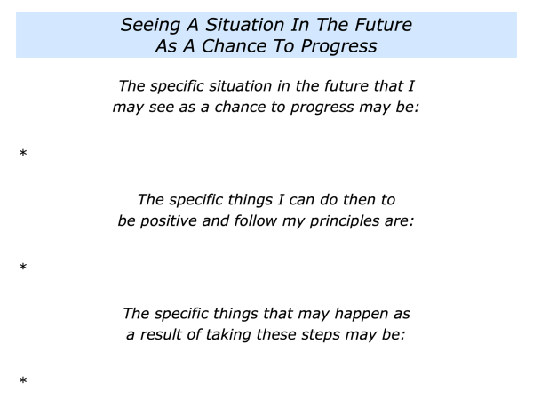 They may then aim to follow the principles embodied in a recovery programme. These can include taking responsibility, helping others and staying healthy one day at a time.