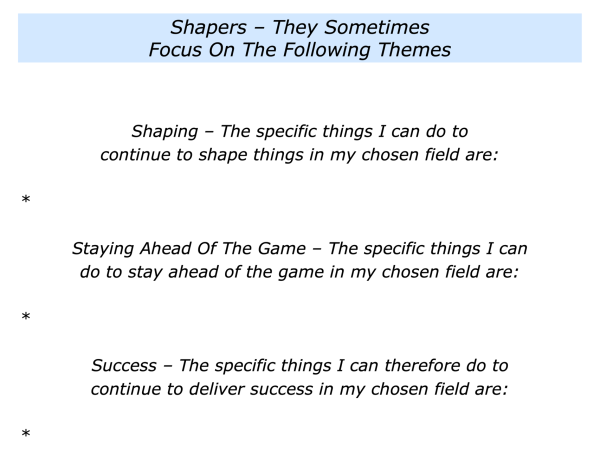 Shapers aim to do pacesetting work. They often have a different kind of psychology. They aim to take the lead, maintain the lead and extend the lead. They make the new rules for the game.