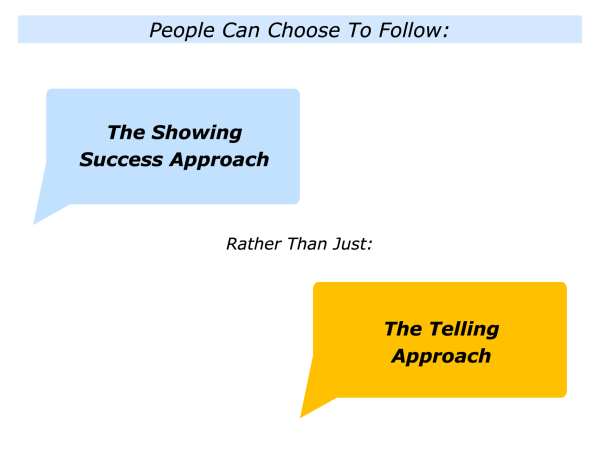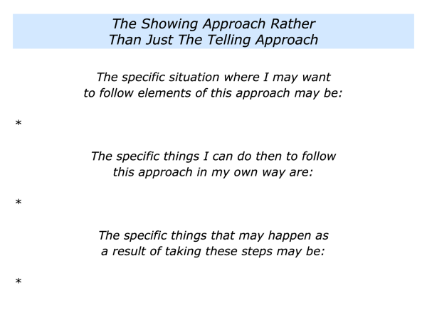 Let’s return to your own life and work. Looking ahead, can you think of a situation where you may want to follow elements of the showing approach rather than just the telling approach? How can you do this in your own way?