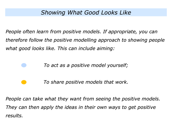 People often learn from positive models. If appropriate, you can therefore follow the positive modelling approach to showing people what good looks like. People can then take the ideas they like and apply these in their own ways.