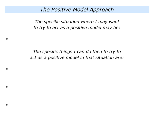 Let’s return to your own life and work. Can you think of a specific situation where you may want to try to act as a positive model? This could be in your personal or professional life.