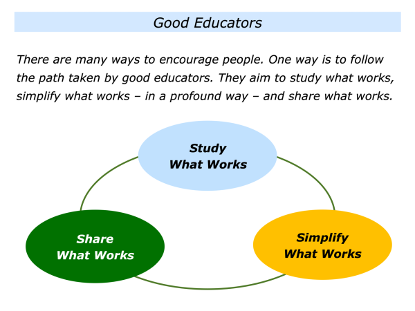 Good educators may also follow this approach. Such people aim to study what works, simplify what works – in a profound way – and share what works.
