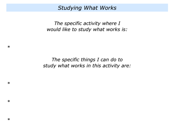 If you wish, try tackling the exercise on this theme. This invites you to do the following things. First, to describe the specific activity where you would like to study what works. Second, to describe the specific things you can do to study what works in this activity.