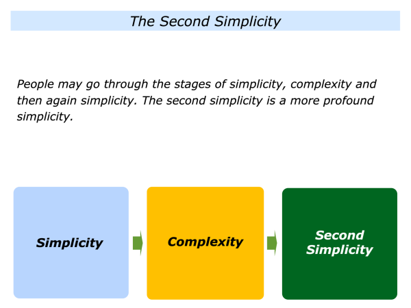 People sometimes go through the following stages in life: simplicity, complexity and then the second simplicity. Let’s explore these themes.