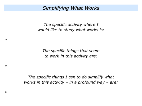 Imagine that you have focused on a specific activity you want to learn about. The next step may be to simplify what works but to do this in a profound way. How to make this happen?
